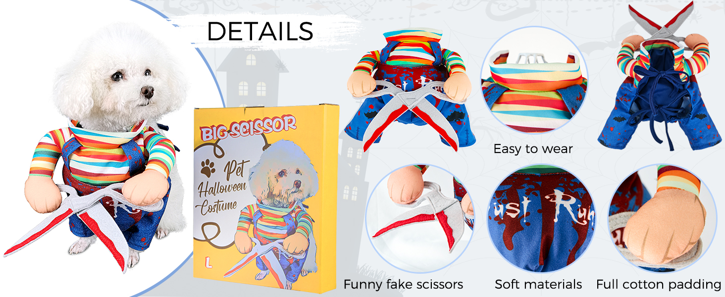 Design: Wearing this quirky scissor doll costume enhances the tension and fear, and it is like a gardener trimming branches in the garden, which is cute and fun. Unique design makes your dog the star of the party.