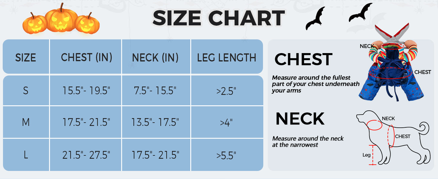 Size S: Chest: 15.5-19.5", Neck: 7.5-15.5", Leg length more than 2.5";Size M: Chest: 17.5-21.5", Neck:13.5-17.5", Leg length more than 4";Size L: Chest: 21.5-27.5", Neck: 17.5-21.5", Leg length more than 5.5". Please measure the measurements carefully and consult our size chart to choose the most suitable product for your pet.